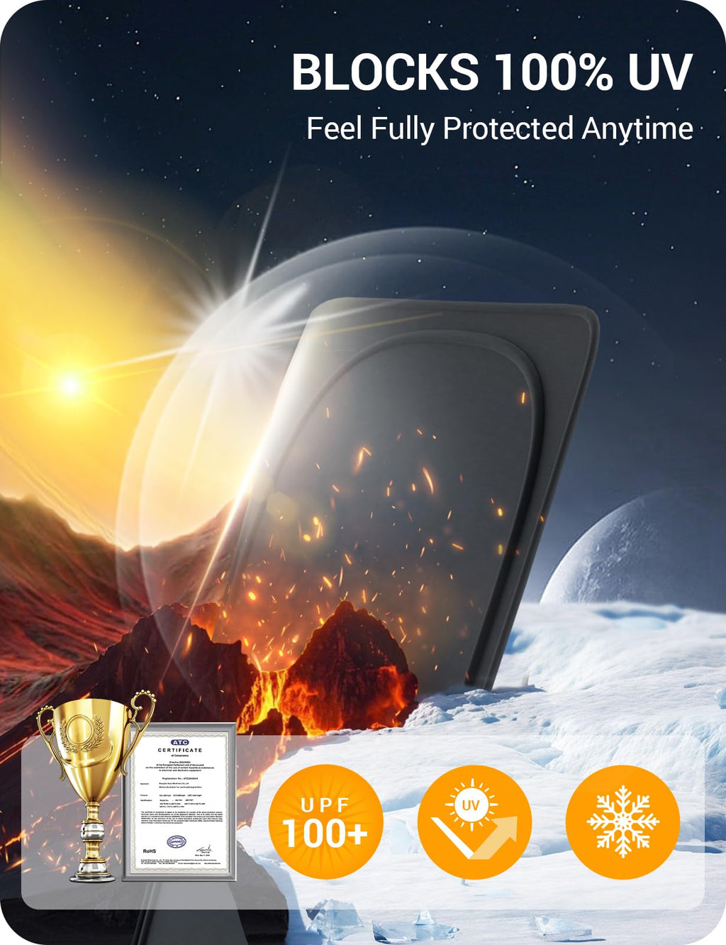 - Effortless Application: No tools needed. Just unfold, snap into place, and you're done in seconds. The flexible steel ring provides a secure fit, while the shade folds neatly into the included storage bag when not in use.