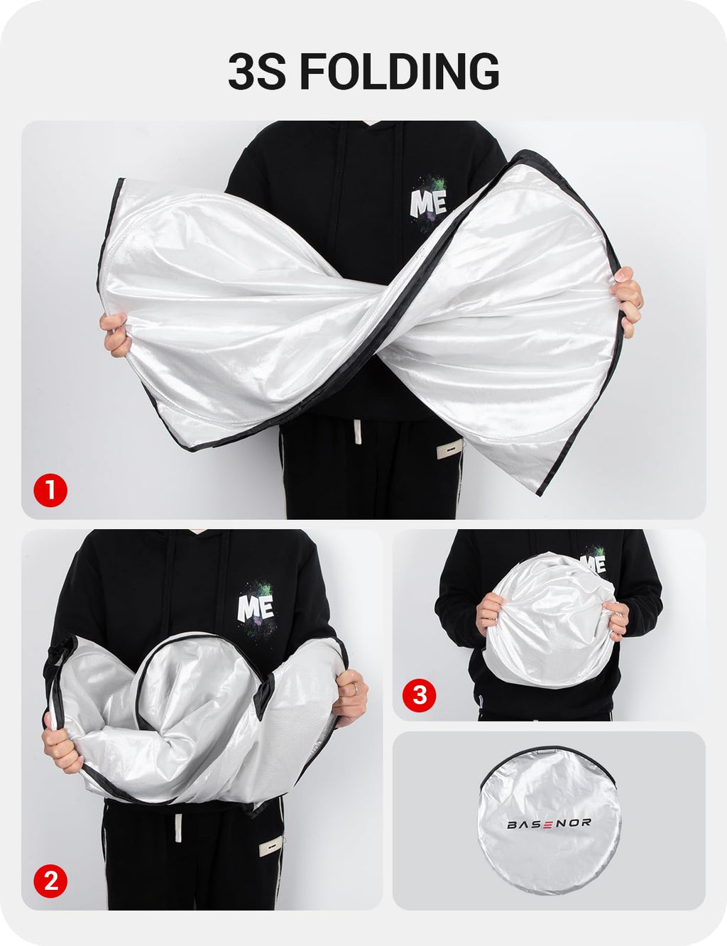 - Durable and Long-Lasting – Built to Endure: BASENOR’s front windshield sunshade is crafted from ultra-high-strength fabric, which is up to 10 times more flexible than other materials. It unfolds and folds with ease, and its superior retractable design can withstand over 10,000 bends without compromising quality, ensuring long-lasting performance and reliability