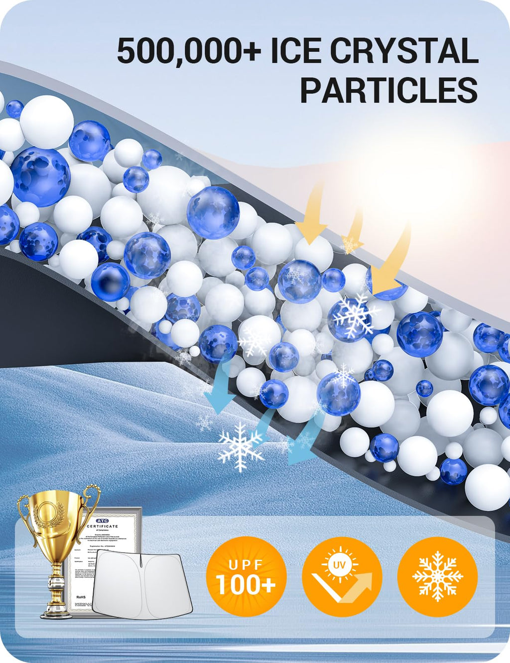 - Blocks 100% of UV Rays - The Ultimate Sun Defense: Our sunshade features groundbreaking ice crystal cooling technology, with over 500,000 ice crystal particles embedded in the fabric. It blocks 100% of sunlight, ensuring your dashboard, leather seats, and more are protected from UV damage while keeping your car’s interior refreshingly cool at a perfect 90°F