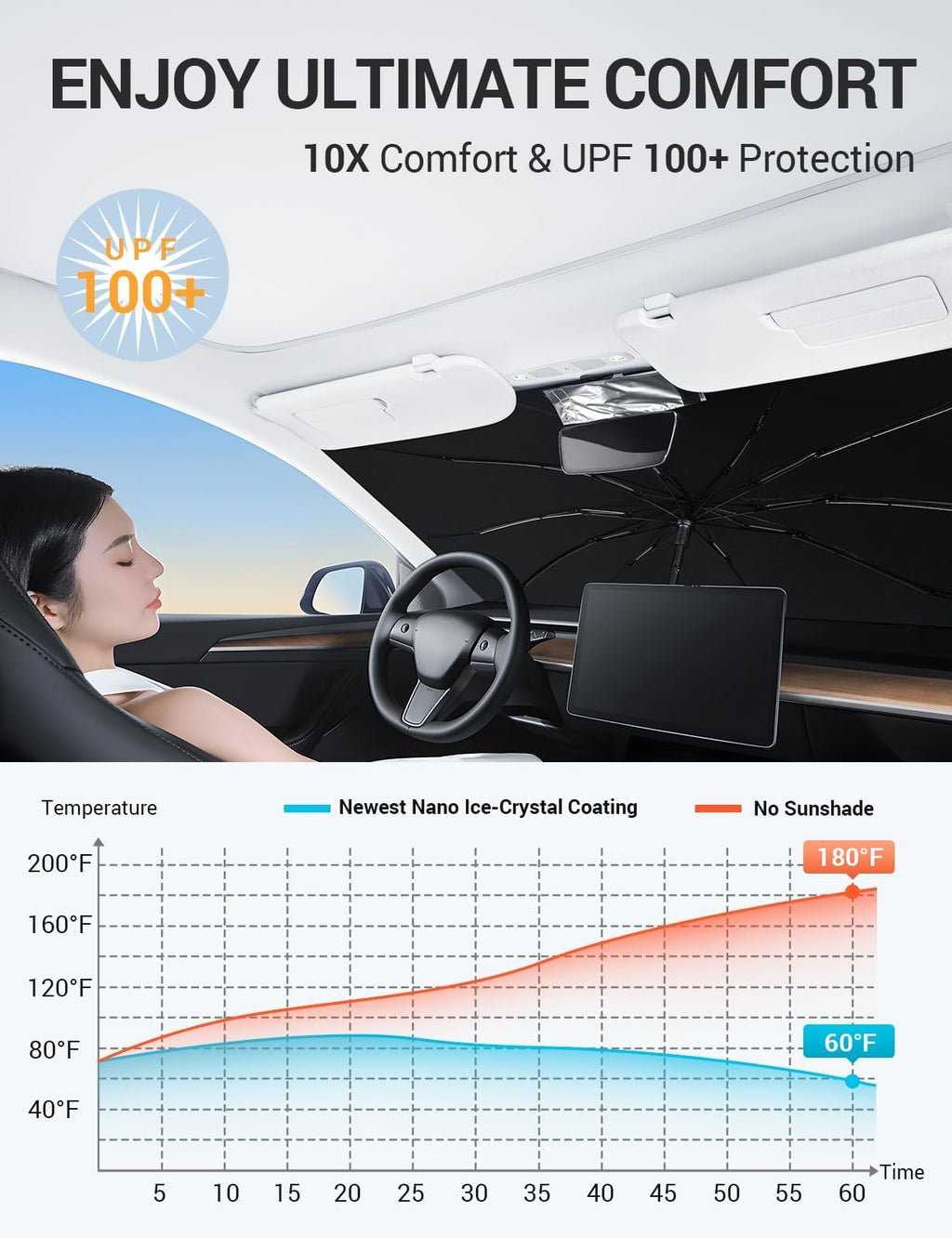 - The Ultimate Sun Defense: BASENOR's Model Y sunshade features groundbreaking ice crystal cooling technology, with over 500,000 ice crystal particles embedded in the fabric. It blocks 100% of UV Rays, ensuring that your dashboard, leather seats, and other interior components are protected from UV damage while keeping your car’s interior refreshingly cool. It's also ideal for commuters looking to take naps in their Tesla.