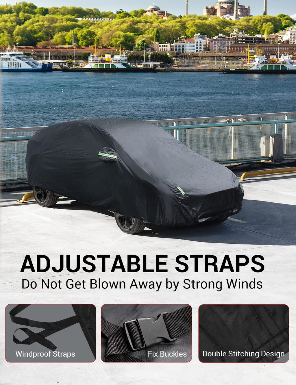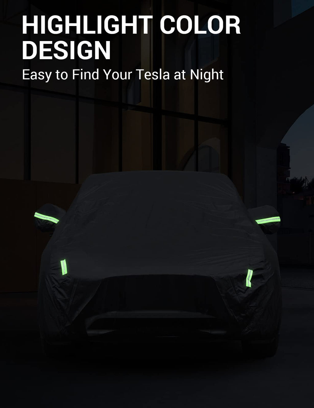 - Wind-Resistant & Safety-Centric: The full exterior cover boasts adjustable shoulder straps to secure your Model Y car cover against strong winds. The reflective belts enhance nighttime visibility, ensuring maximum safety for you and your Tesla.