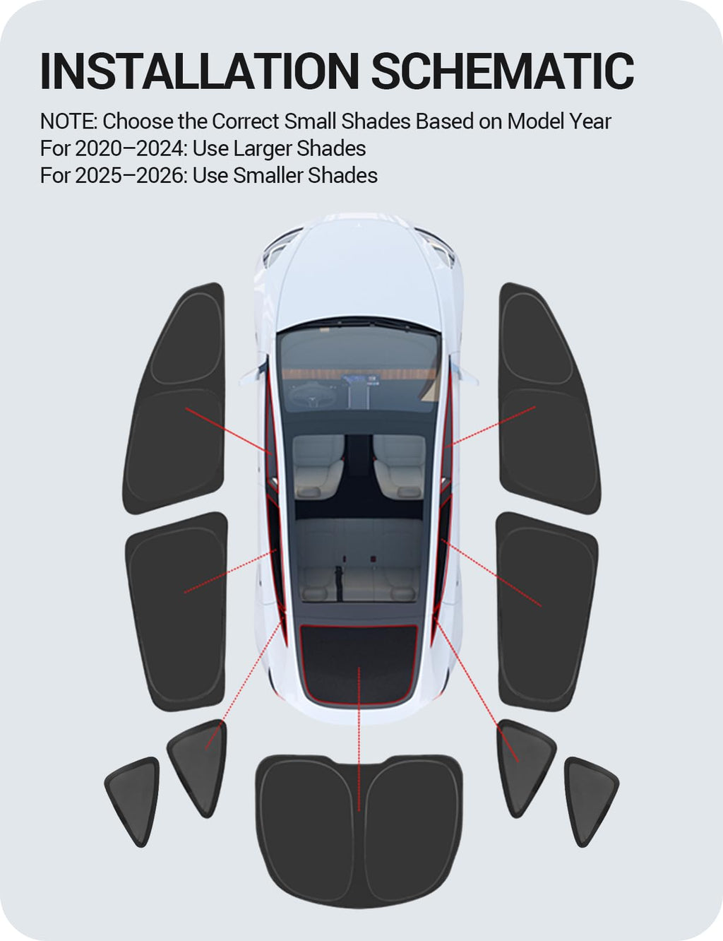 - Effortless Application: No tools needed. Just unfold, snap into place, and you're done in seconds. The flexible steel ring provides a secure fit, while the shade folds neatly into the included storage bag when not in use. Please note: Among the full set of sunshades, there are four small window pieces. Use the larger small shades for 2020–2024 Model Y, and the smaller ones for 2025–2026 Model Y