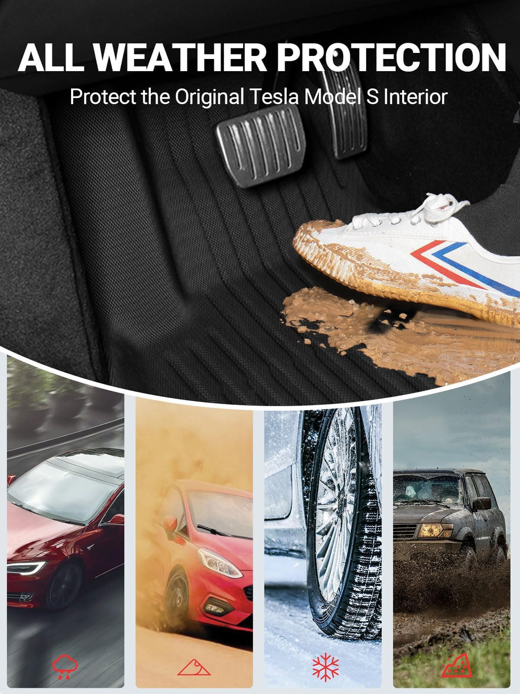 - All-Weather Protection: Whether you're dealing with rain, snow, or mud, these Model S floor mat are up to the task. They feature a raised lip design that effectively traps and contains any liquid or dirt, preventing it from seeping onto your car's carpet. Keep your Tesla Model S's interior stay clean and protected.