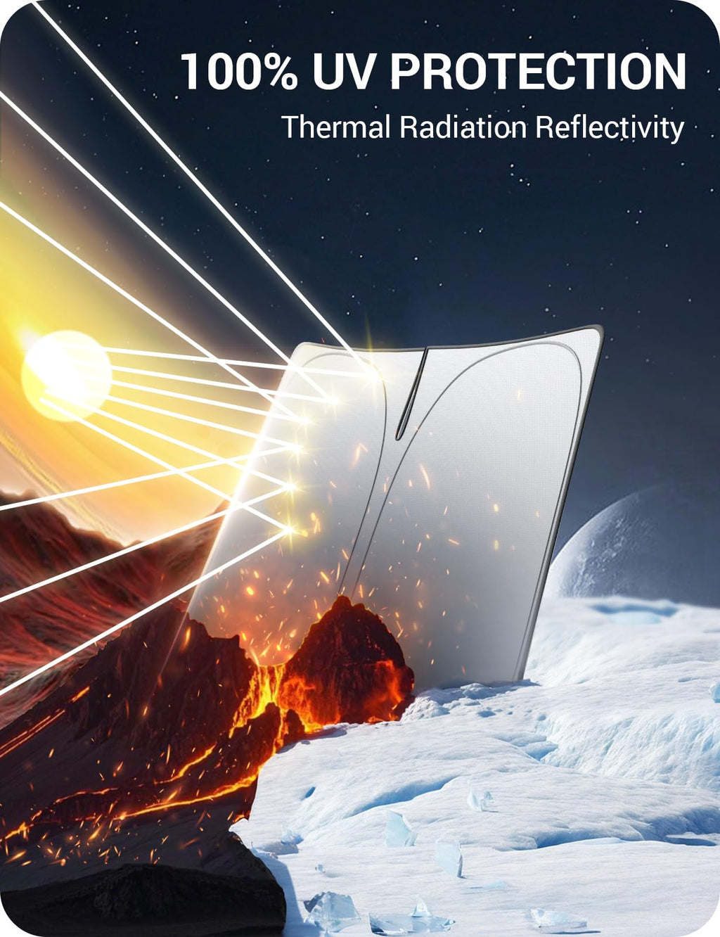- Blocks 100% of UV Rays - The Ultimate Sun Defense: Our sunshade features groundbreaking ice crystal cooling technology, with over 500,000 ice crystal particles embedded in the fabric. It blocks 100% of sunlight, ensuring your dashboard, leather seats, and more are protected from UV damage while keeping your car’s interior refreshingly cool at a perfect 90°F