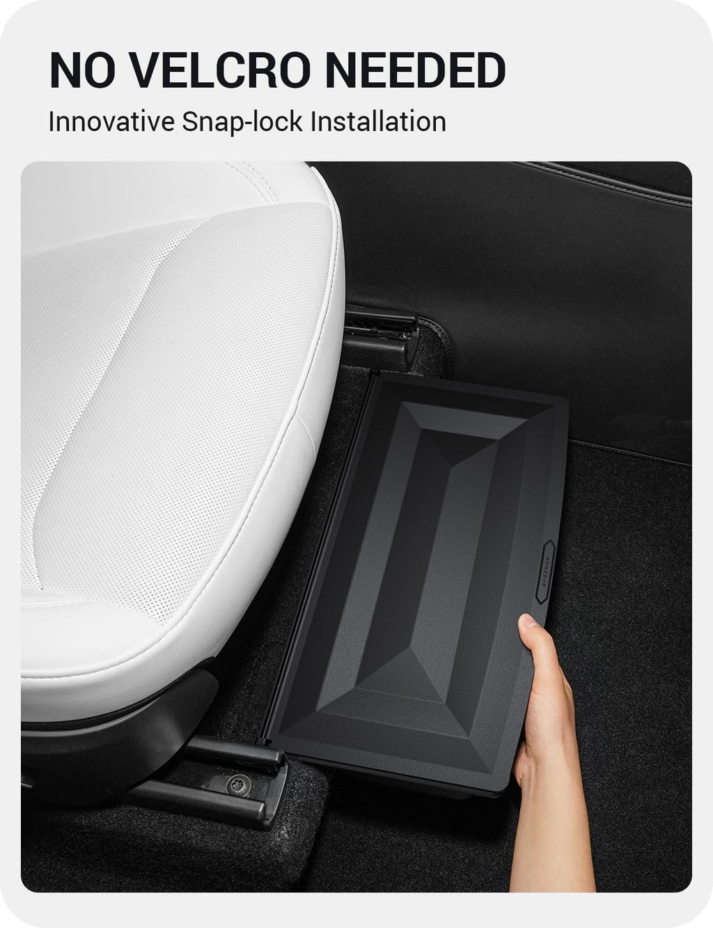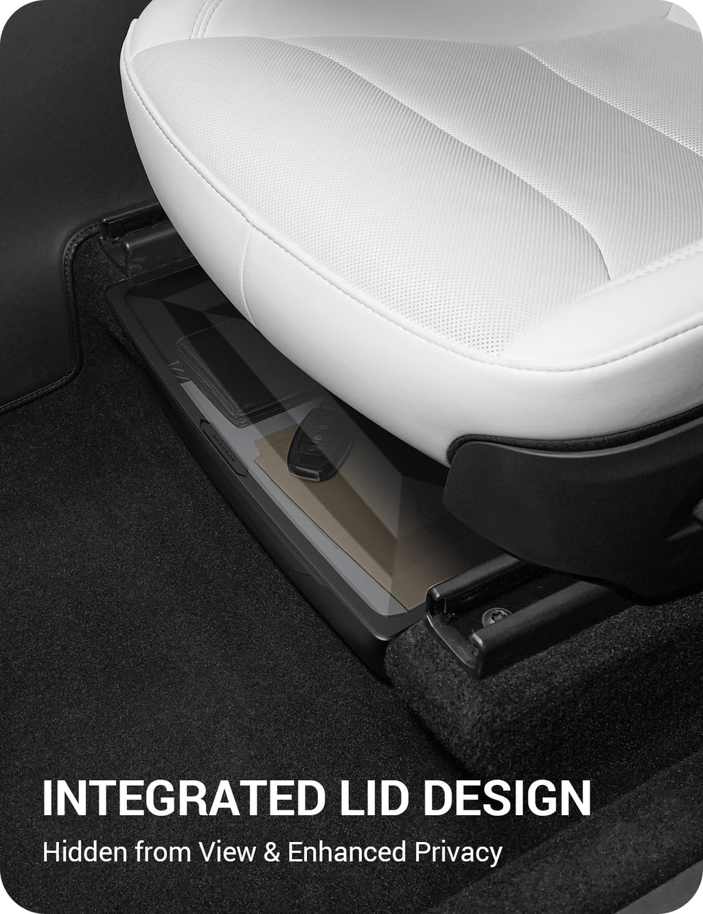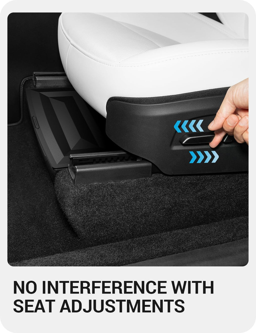 - Perfect Fit (Proprietary Design): Incredible Custom Design Loved by 500,000+ Tesla Owners. Custom-designed for the 2025–2026 Tesla Model Y Juniper (Standard/Premium/Performance), the Model Y under-seat storage box delivers a precise, gap-free fit. Engineered with 1:1 digital scanning, it integrates seamlessly with your interior without affecting seat adjustments, floor mats, or rear-seat airflow, keeping vents unobstructed
