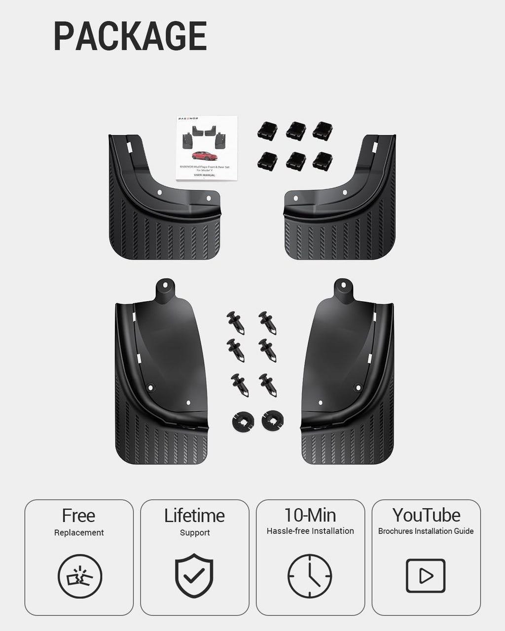 - No Drilling or Tape Required: Utilizing original mounting points, these flaps ensure a seamless fit, preserving your vehicle’s pristine appearance. Simply align the holes, secure with screws, and enhance your Tesla’s protection with added stability from bottom fixing holes and washers