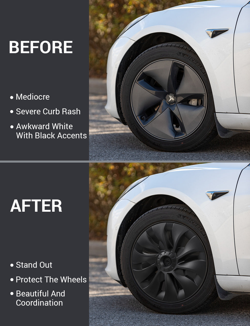 - Premium Protection: The Model 3 Wheel Cover is made of high-quality ABS material, waterproof and high-temperature resistant, and durable. Effectively protect your wheels. Great for covering curb rash!