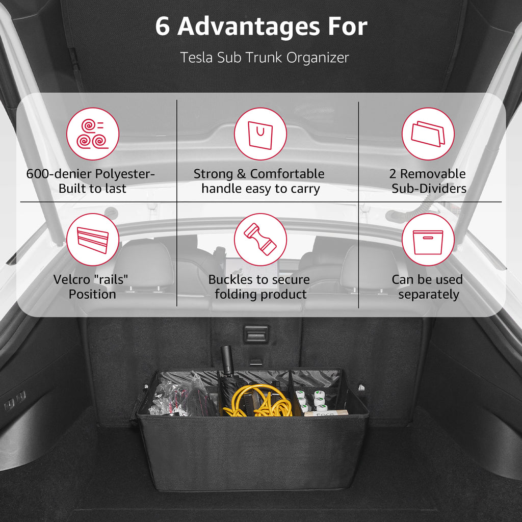 - Multipurpose Design: With 3 compartments, removable sub-dividers. Every panel is reinforced with heavy-duty stiff base plates. You can organize your Model 3 Model Y related stuff and organize important emergency equipment, charging adapters, cables, groceries, sporting goods, cleaning supplies, pet and kid toys, snacks, and much more. To help keep you super-organized