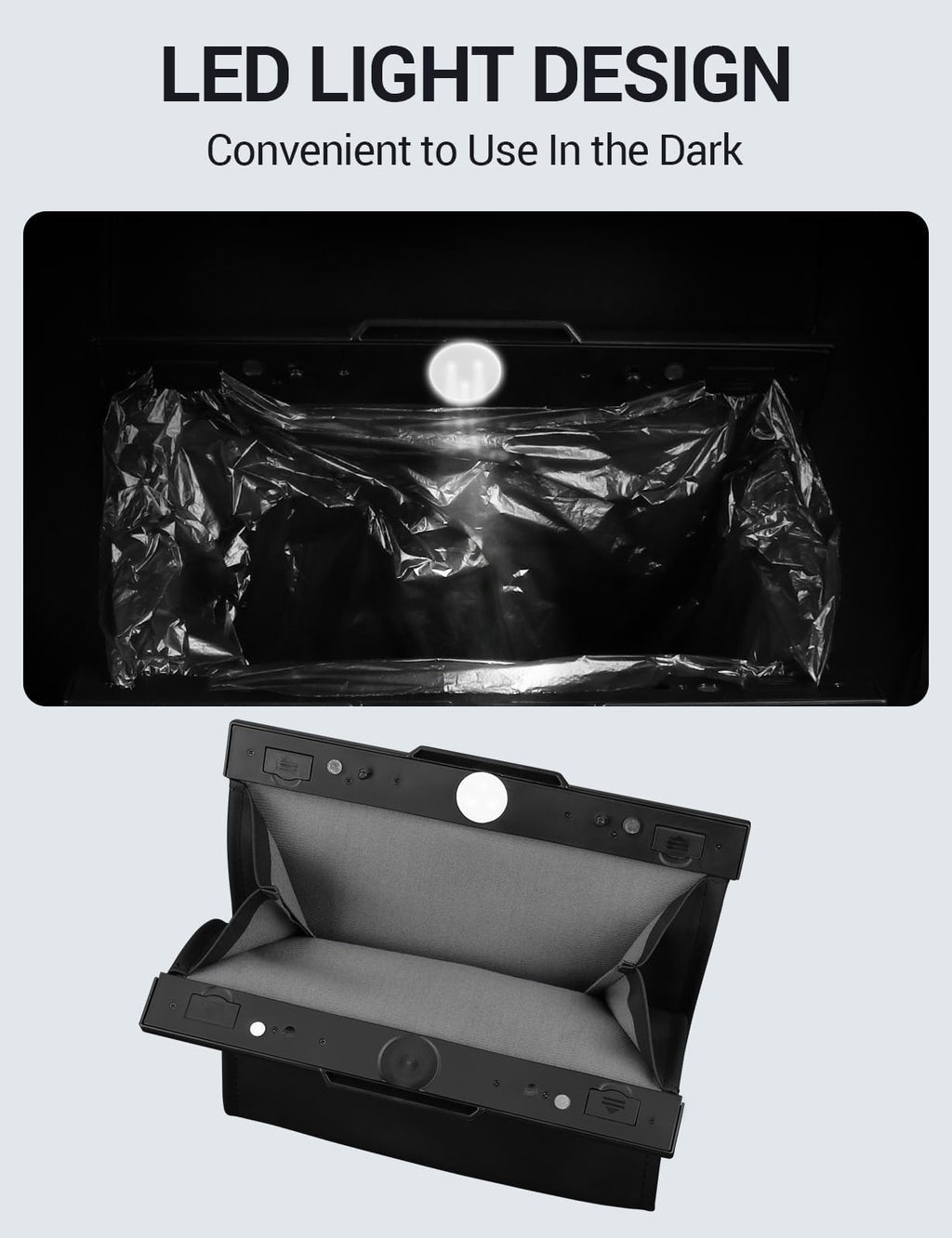 - LED Light Design: Designed with automatic LED lights, the Model Y trash bag offers enhanced usability during night-time, and equippes with a strong magnetic switch for easy opening and closing, making it easier to find and use the garbage bin, and promoting a clean and tidy Tesla interior